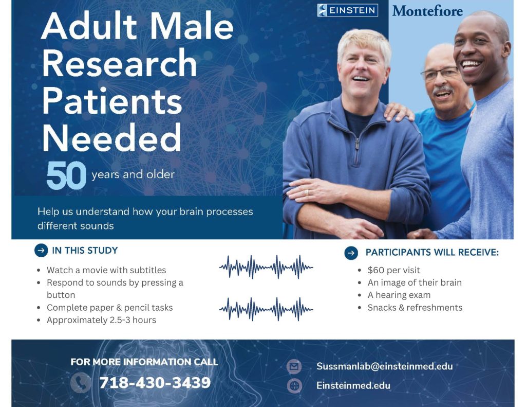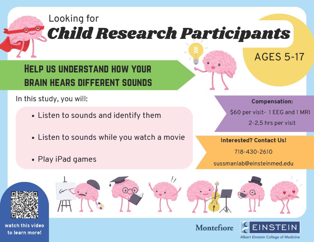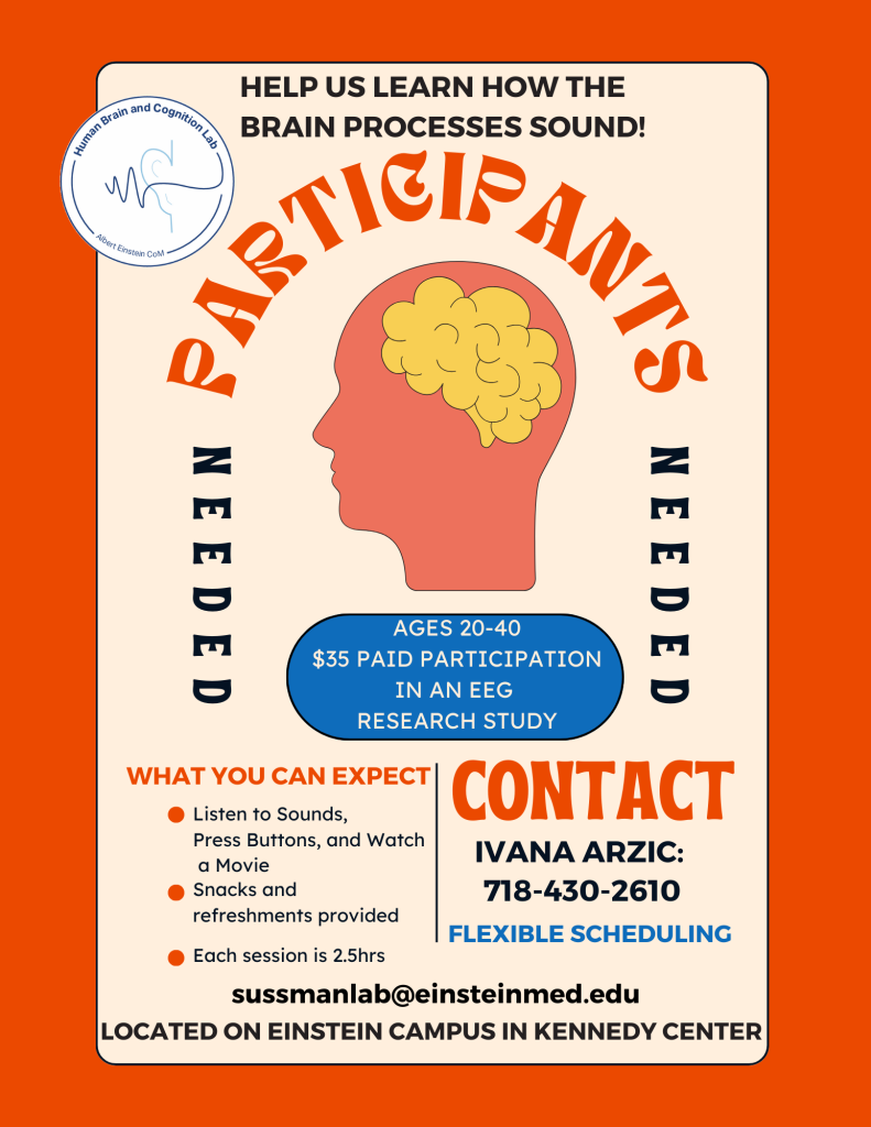 The Sussman Lab is currently studying how the human brain processes sound. If you are between the ages of 20 and 40, you may be eligible to participate in an EEG research study to help us achieve our goals. Our current study is 2.5 hrs long and pays $35 for your participation (plus public transportation fees with receipt). The study includes EEG cap placement, watching a movie, and pressing buttons in response to sounds. I hope you consider participating and helping us learn more about the human brain. If you are interested, we will need to complete a short 5-minute survey overt the phone to confirm eligibility. After that, we can schedule your visit at a time that is convenient for you.
